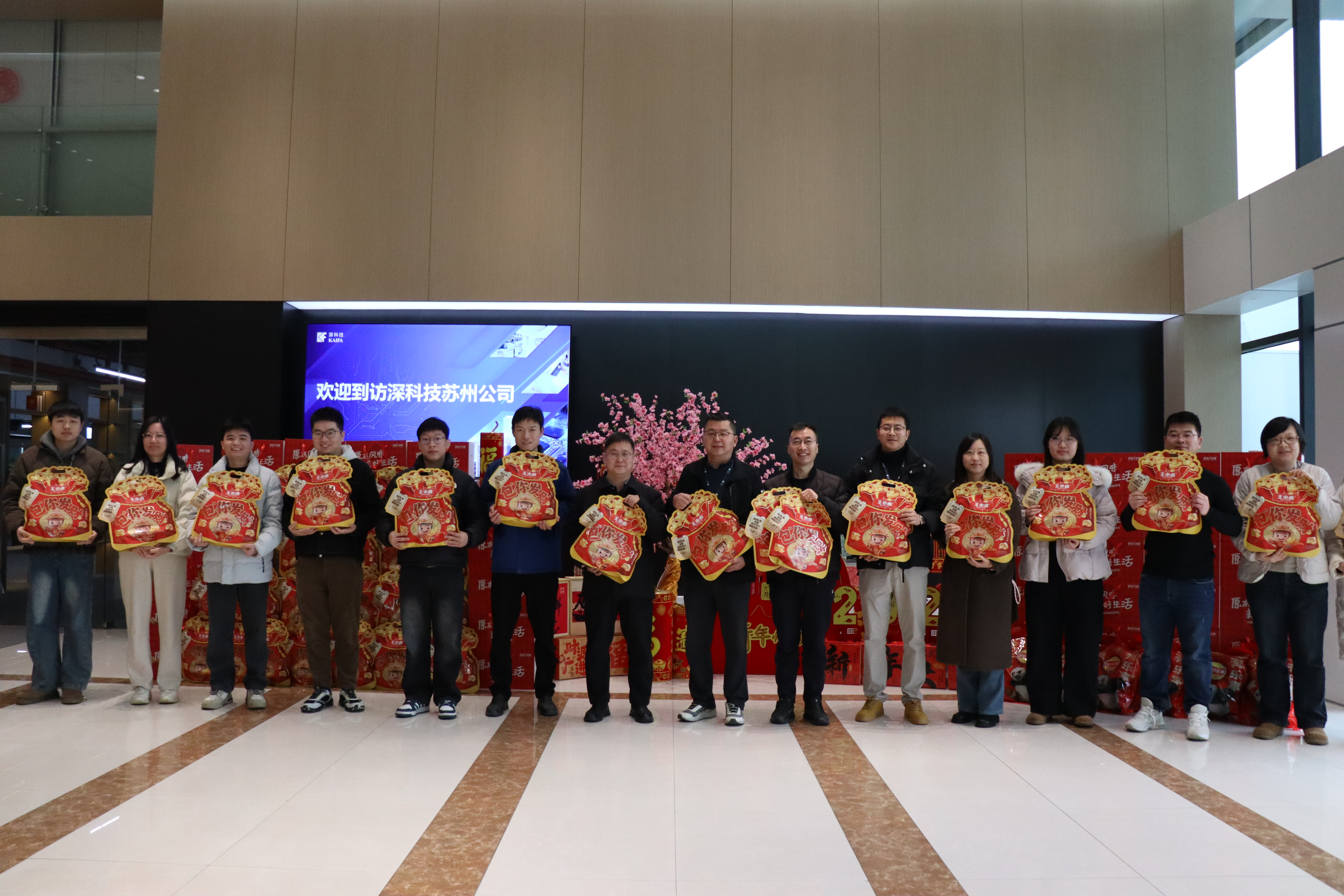 2月6日,深科技蘇州公司資深顧問王勁剛、總經(jīng)理何耀輝帶領各分工會主席,將一份份年禮、一聲聲問候送到職工手中,以暖心行動傳遞“家”的溫度。